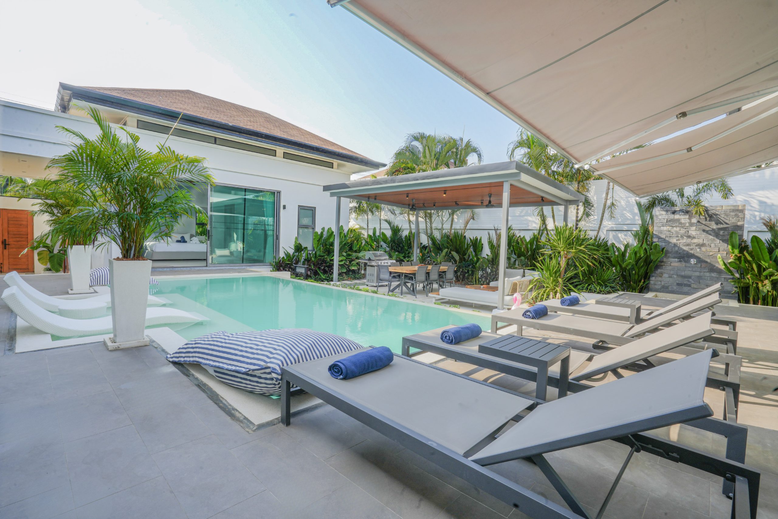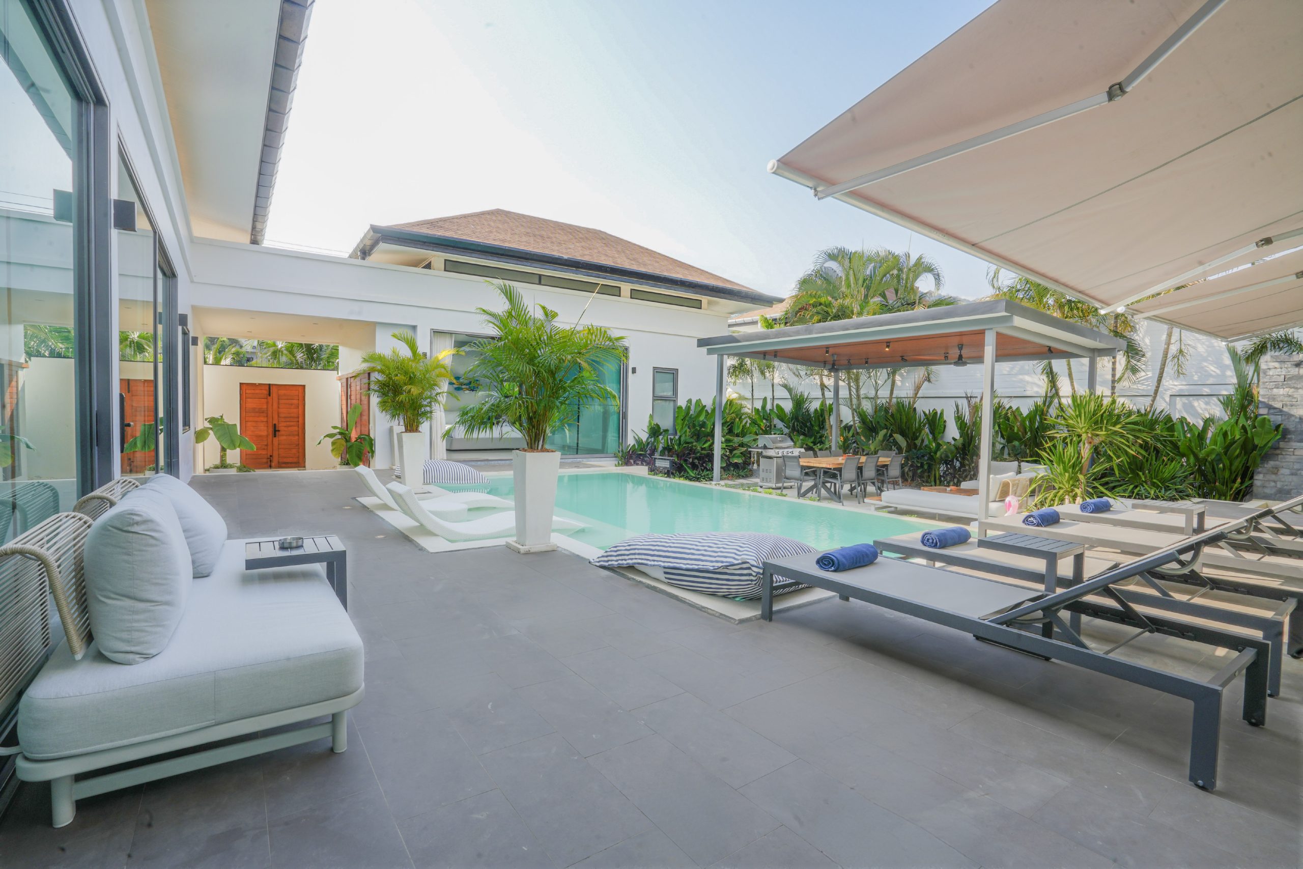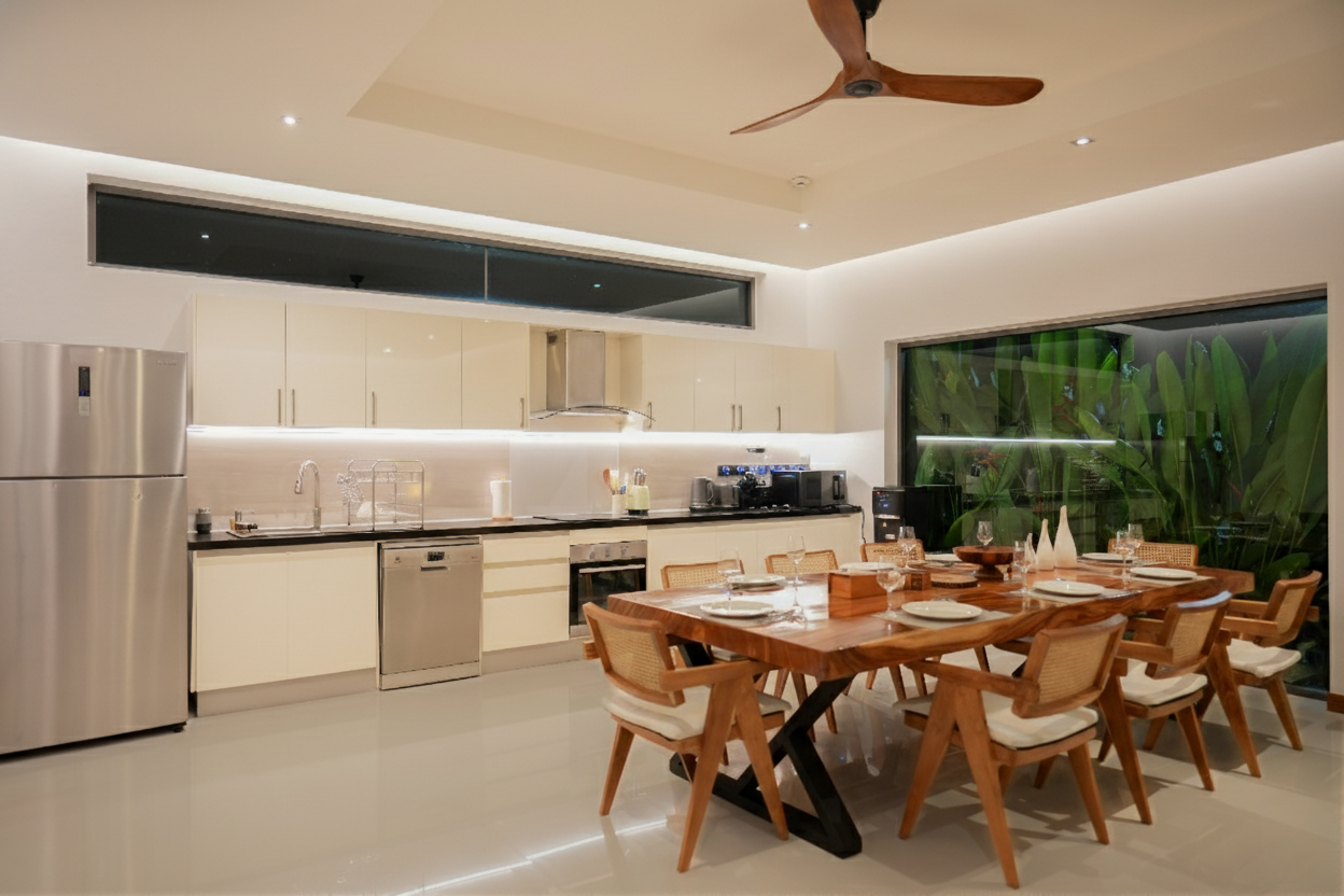 Welcome to Villa Tropicana – Luxury 4 Bedrooms Pool Villa in Rawai, Phuket, a beautifully designed private pool villa offering the perfect balance of comfort, privacy, and tropical elegance. The villa features 3 en-suite bedrooms और 1 bedroom with separate bathroom, making it ideal for families or groups. All living areas face the stunning private swimming pool and outdoor area, creating a seamless indoor-outdoor flow and a perfect layout for privacy during your holiday. The fully equipped kitchen with modern appliances is perfect for home-cooked meals or long stays, while the spacious living room with refined Chiang Mai-inspired décor provides a warm and inviting space to relax.